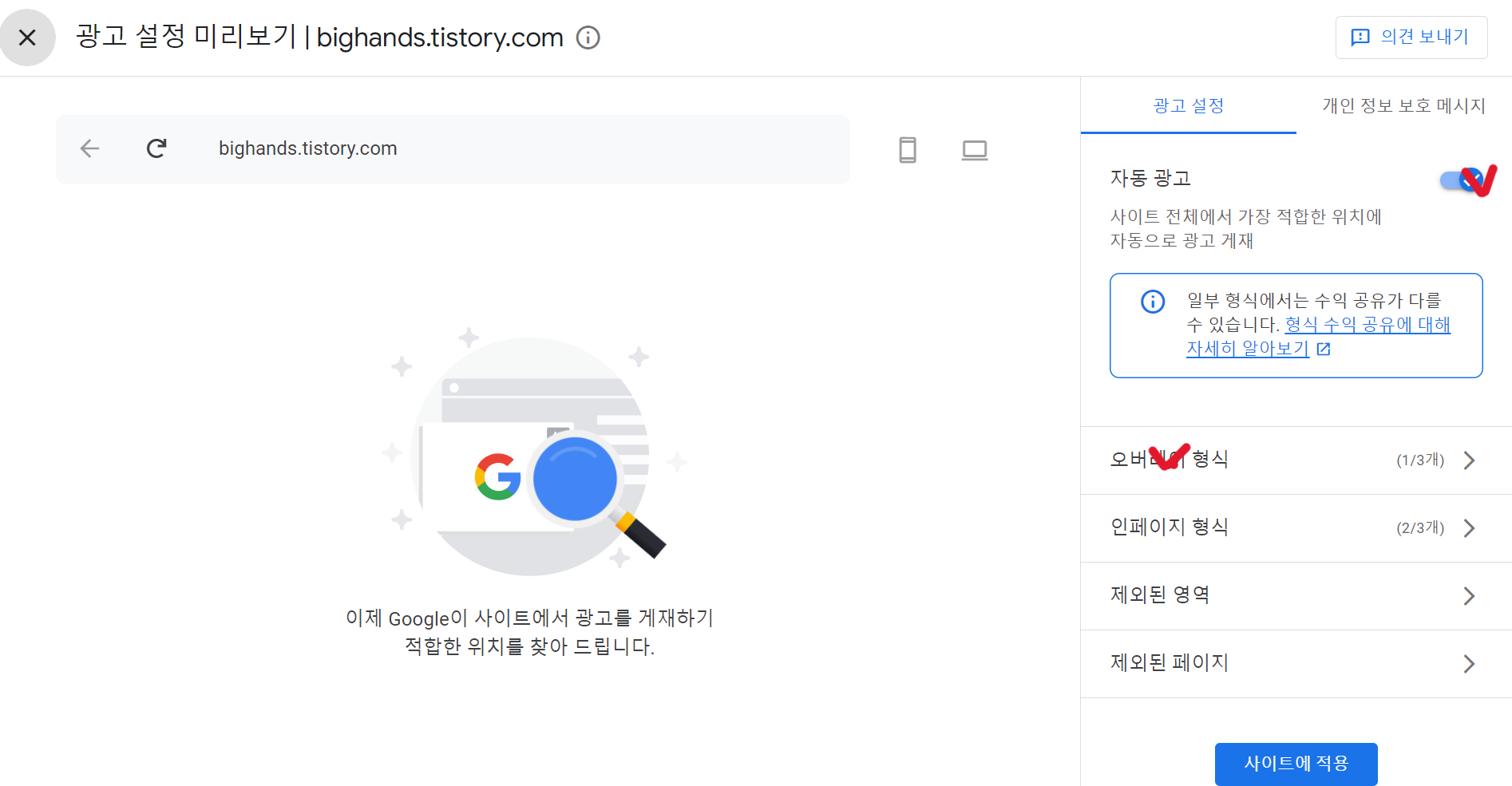 광고 설정 미리 보기 화면으로 바뀌었다면 우측 자동광고를 클릭한후 아래의 오버레이 형식을 클릭합니다.