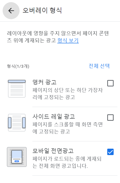 오버레이 형식으로 화면이 바뀌었다면 모바일 전면광고를 클릭합니다.